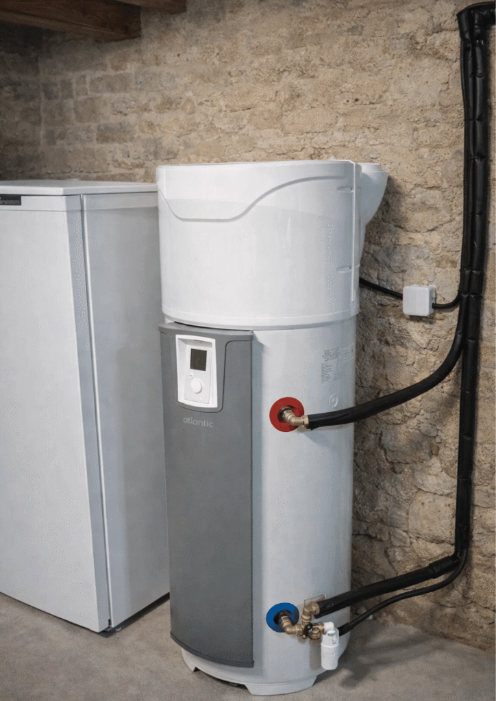 Vu côté technique, un chauffe-eau thermodynamique à air extérieur produit et stocke l’eau chaude sanitaire grâce à une pompe à chaleur intégrée au ballon. Il fait la captation des calories de l’air extérieur via des gaines, séparant ballon et prise d’air, avec indépendance vis-à-vis de l’air intérieur et un fonctionnement stable quelle que soit la configuration du logement.